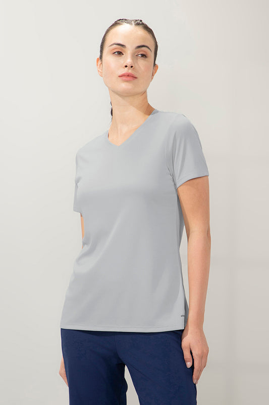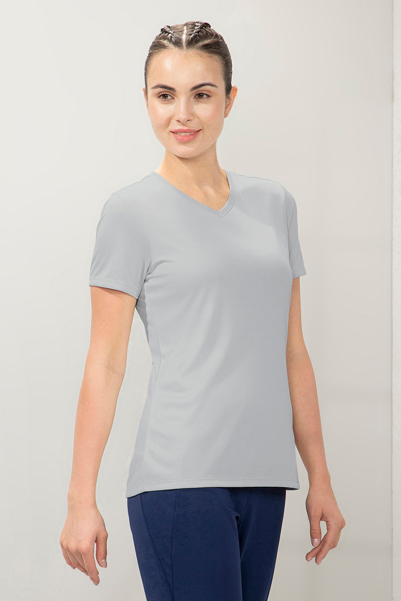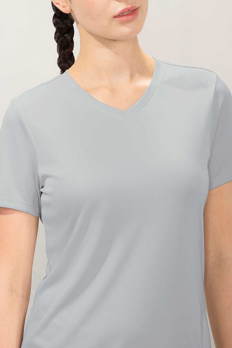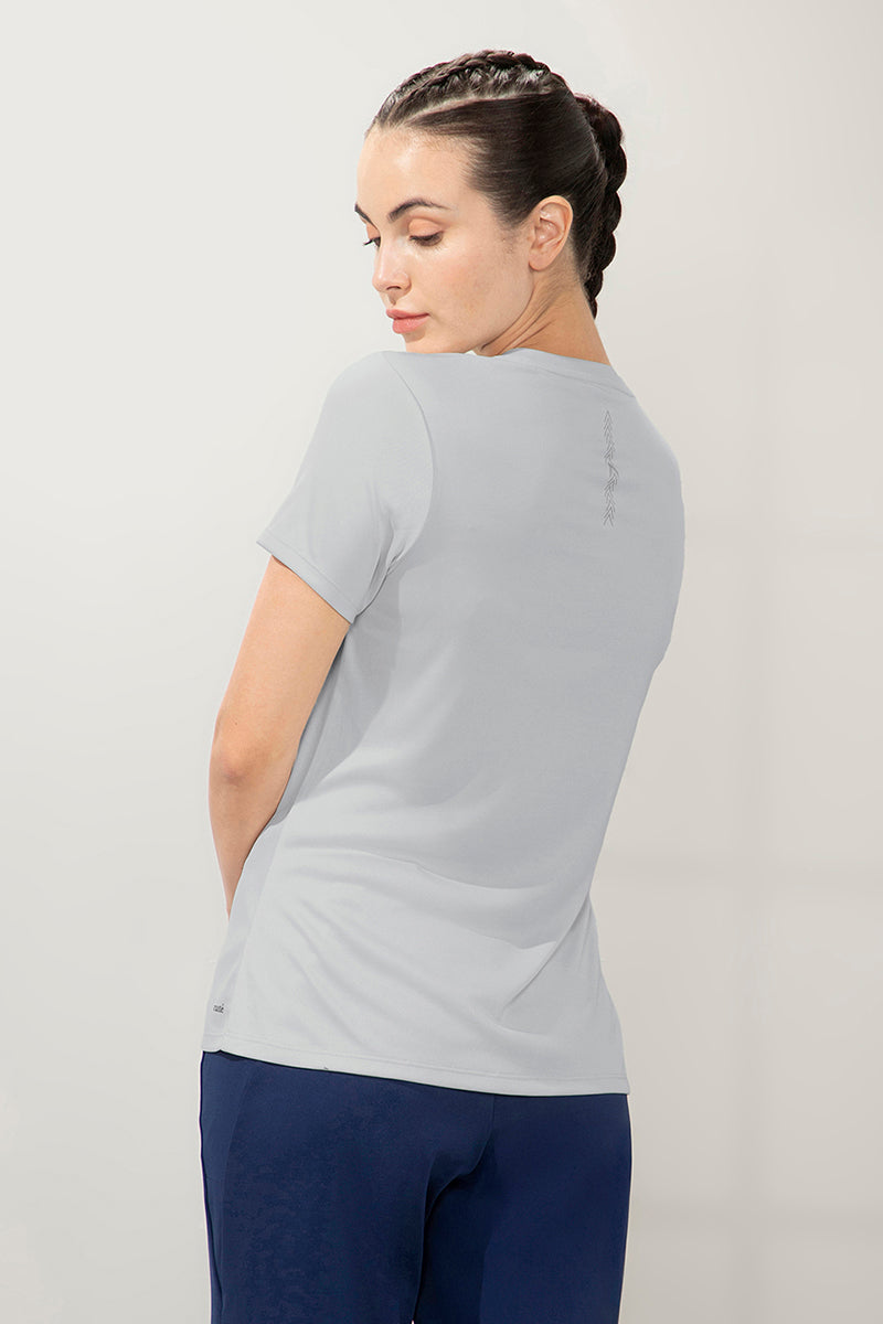 Our Energize Active V-neck Tee is designed for swift motion and sleek style. Quick dry moisture wicking finish offers a fresh feel during and post your workout. Perfect for running, jogging, dancing or your daily gym routine, this tee offers a relaxed fit for easy movements. Pair this with leggings, capris or tights to complete the look.